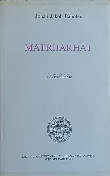 U svom čuvenom delu MATRIJARHAT Bahofen izlaže povest razvoja čovečanstva od njegovog prastanja do hrišćanstva. Iz pojedinačnih podataka antičkih etnografa, iz mitova i simbola čiji tajanstveni jezik on tumači, iz izveštaja o primitivnim narodima, Bahofen izvlači delove za mozaik tri uzastopne glavne epohe. Svaka od ovih nosi jedinstven pečat osnovne snage postanja, religije: htonični heterizam koji ne zna za porodicu, za oca; demetrijska kultura s principatom žene; i apolinijski, duhovni patrijarhat. Tek ovom vremenu pripada monogamska, patrijarhalna porodica. Po prvi put se, ovde, ljudska porodica sagledava kao promenljiva veličina, tj. kao povesno, kulturno i religiozno uslovljena pojava. Ovo revolucionarno saznanje prokrčilo je put istraživanju koje je otada u etnologiji i povesti religije, u pravnoj nauci i u sociologiji stiglo do obilja novih rezultata. Ali MATRIJARHAT Johana Jakoba Bahofena ostaje fundamentalno delo, neprolazna tvorevina jednog istinskog genija.
